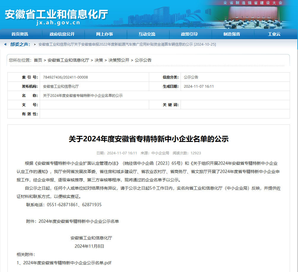 近日安徽省工業(yè)和信息化廳發(fā)布了2024年度專精特新中小企業(yè)公示名單集團所屬池州市數(shù)據(jù)產業(yè)有限公司榮獲2024年度安徽省“專精特新”中小企業(yè)。