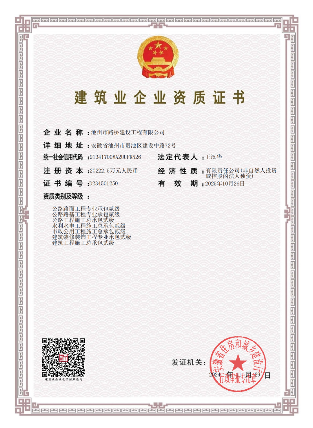公司發(fā)展四年多,已成功取得建筑工程施工總承包貳級(jí)、公路工程施工總承包貳級(jí)、市政公用工程施工總承包貳級(jí)、建筑裝修裝飾工程專業(yè)承包貳級(jí)、公路路面工程專業(yè)承包貳級(jí)、公路路基工程專業(yè)承包貳級(jí)等資質(zhì)。如今,獲批水利水電工程施工總承包貳級(jí)資質(zhì),為公司業(yè)務(wù)板塊拓展了更高更廣的發(fā)展空間。