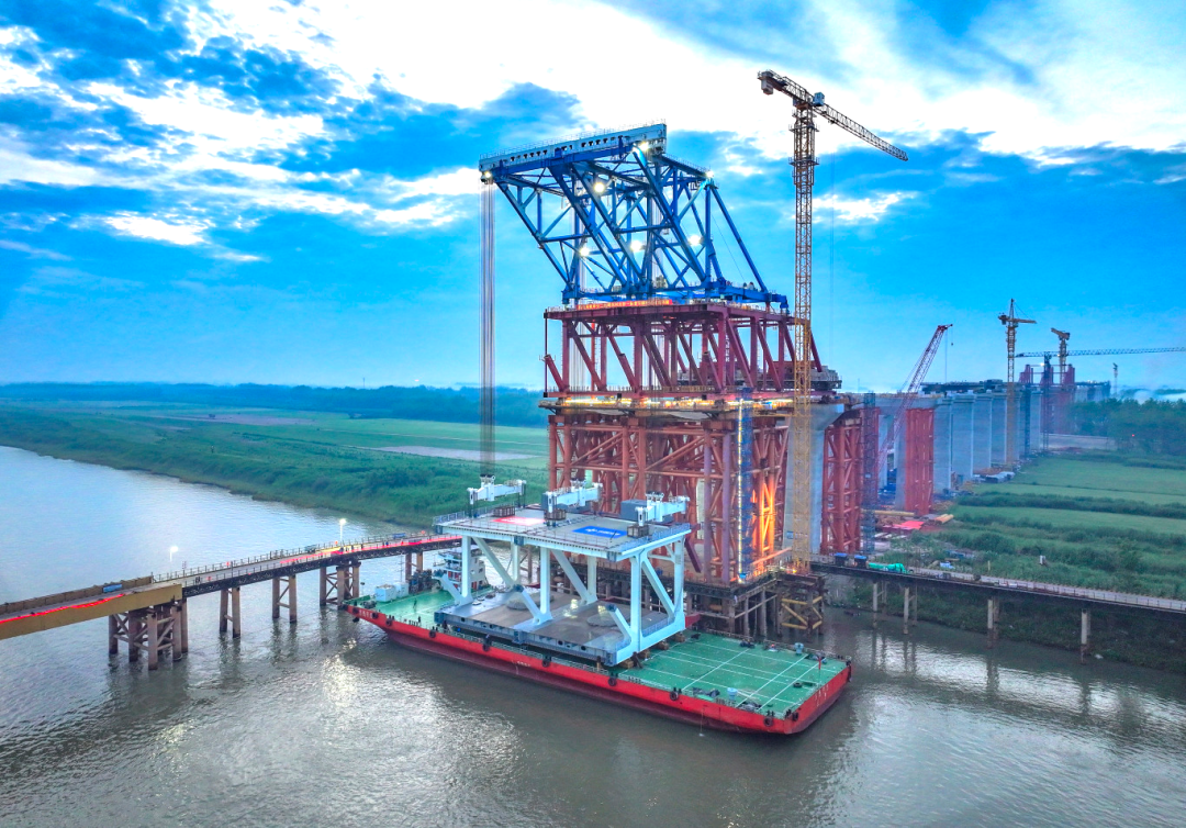 大橋連接銅陵市樅陽(yáng)縣和池州市貴池區(qū),全長(zhǎng)3108.5米,采用上層6線高速公路、下層2線高速鐵路和預(yù)留2線城際軌道布局,其中跨江主橋長(zhǎng)1768米,采用主跨812米雙層鋼桁梁斜拉橋,主橋共計(jì)69個(gè)節(jié)段,總重91448.6噸。