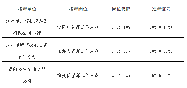 根據(jù)《池州市投資控股集團(tuán)2025年公開招聘工作人員公告》要求,由于入圍體檢的考生中有部分人員自動放棄或不合格產(chǎn)生了人員空缺?,F(xiàn)按《公告》要求,視崗位情況進(jìn)行遞補(bǔ)?,F(xiàn)將入圍遞補(bǔ)體檢情況公告如下: