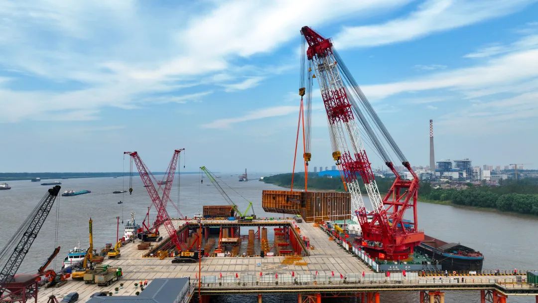 據(jù)悉,鋼圍堰是在深水中建造水利工程時制作的圍護結構,能防止水和土進入修建位置,以便在圍堰內排水和開挖基坑。為確保鋼圍堰順利運輸?shù)跹b,項目建設管理單位會同施工單位中鐵大橋局項目部、海事部門、航道管理部門多次召開專家論證會,提前進行方案預演和技術交底,利用伸縮臂挖機提前對圍堰范圍內的河床進行清理,采用5000噸級運輸船進行運輸,拋錨定位后使用1000噸全回轉浮吊+4根定制吊繩進行吊裝下放。