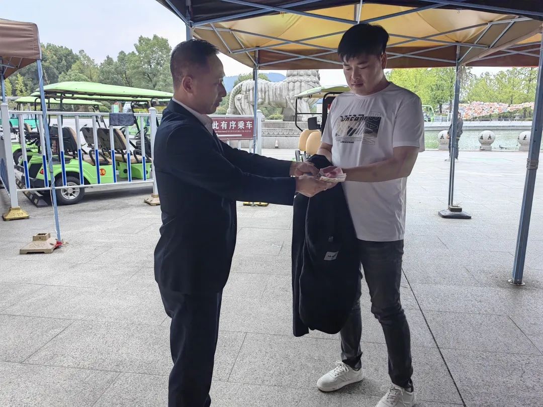 游客胡先生通過(guò)景區(qū)工作人員得知自己的外套在觀光車起點(diǎn)站,隨身物品保存完好,十分激動(dòng),收到衣物后連聲道謝。趙小平回應(yīng)稱:“在我們景區(qū),任何一位員工,拾到游客財(cái)物都會(huì)主動(dòng)歸還游客的。”