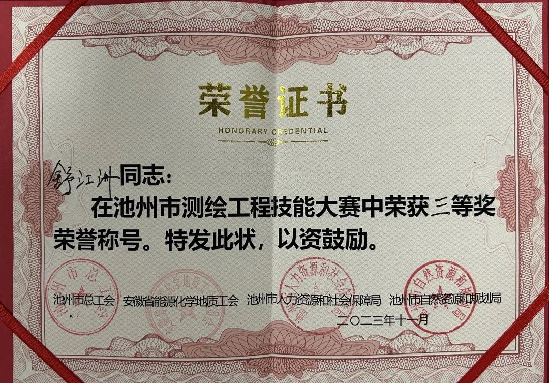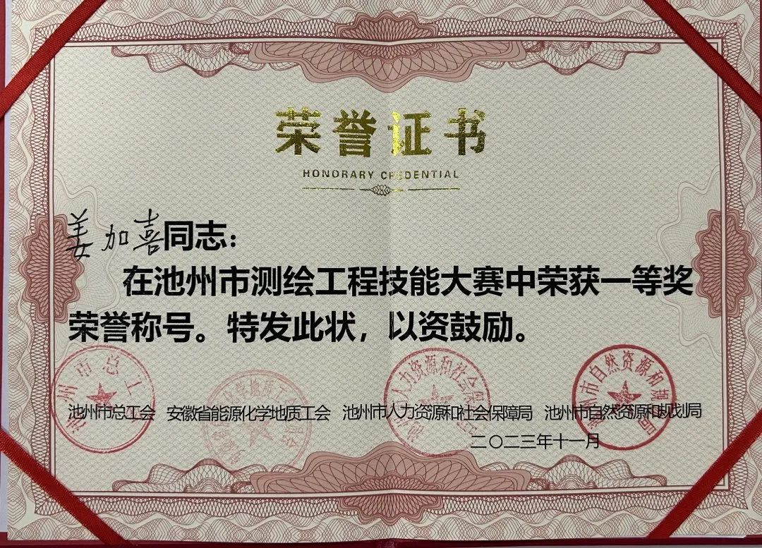 大賽設(shè)置了理論知識測試、團(tuán)體技能操作和個(gè)人技能操作三個(gè)環(huán)節(jié)。設(shè)計(jì)總院5名職工參賽,參賽選手們先后完成了GNSS-RTK施工放樣、1:500數(shù)字地形圖測繪、四等水準(zhǔn)測量、測繪理論知識等多個(gè)項(xiàng)目,積極將所學(xué)理論知識轉(zhuǎn)化為實(shí)操技能,展現(xiàn)了良好的競技風(fēng)貌。經(jīng)過激烈地角逐,池州市規(guī)劃勘測設(shè)計(jì)總院有限公司榮獲團(tuán)體一等獎,所屬測繪分院職工姜加喜和舒江洲兩位同志分別獲得個(gè)人賽一等獎和三等獎。